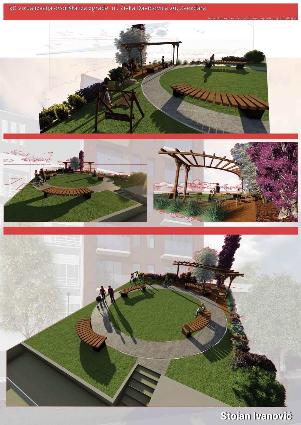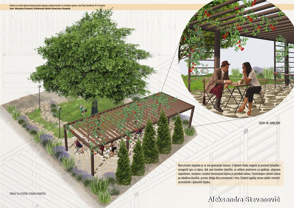Komisija je od svih pristiglih idejnih rešenja/projekata spoljnog uređenja dvorišta stambene zgrade u ulici Živka Davidovića 29 na Zvezdari napravila uži izbor u koja su ušla tri rešenja sledećih učesnika: